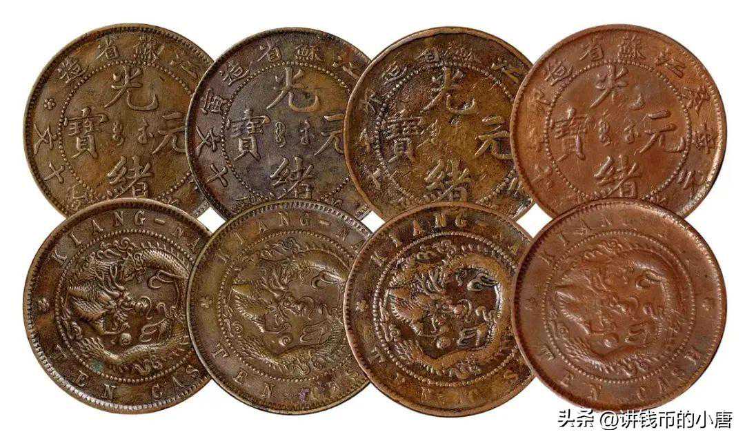 上面三枚是我们熟知的“江南混江苏”,两个省份的铜元为何会凑到一块去?其实答案很简单。首先说说江南省是怎么来的吧,清顺治年间,因为明代南直隶地区在长江以南故而设立江南省以便管理,之后改分为江苏和安徽二省,光绪年间其实江南省早已不复存在,但是地方钱局和中央有时仍然以“江南”记局以名,1896年清政府设立了“江南铸造银元制钱总局”,分为东、西二厂,东厂铸银元,西厂铸制钱,1901年,西厂改铸铜元。江南省是铸造铜元数量最庞大的省份之一,机器设备也十分的充裕,因此还代江苏省铸造了大量的“光绪元宝”,而“江南混江苏”就是这个环境下,工人工作疏忽,导致正反面模具混用造成的。由于1901年~1903年江苏的铜元都是江南西厂代铸的,所以“江苏混江南”也在情理之中。