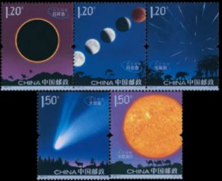 中国邮政在2020年6月21日发行《天文现象》特种邮票一套五枚。6月21日正好是十年一次的天文奇观—日环食上演,所以邮票也选择日环食、月食、流星雨、大彗星和水星凌日的天文现象。河南省邮票印刷厂在承印这套邮票的过程中,除了使用很多独特工艺,以便更好的展现天文现象本身,还首次使用了"四角星形"的异形齿孔,寓意星空闪耀,以便追寻夜空中最闪亮的星。