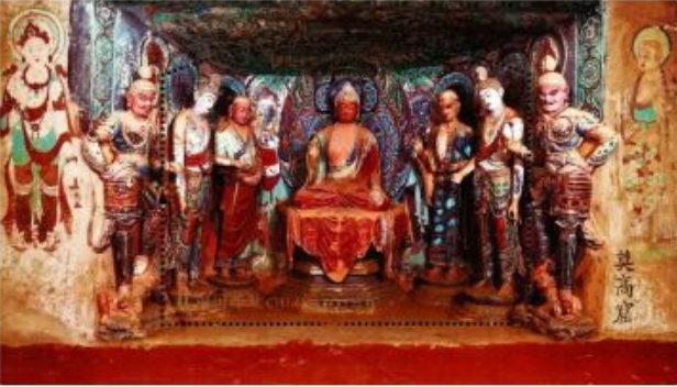 中国邮政在2020年9月26日发行《莫高窟》特种邮票一套四枚、小型张一枚。邮票选择了莫高窟营造鼎盛时期修筑的佛像,展现出其恢弘大气,造像精妙。北京邮票厂负责这套邮票的印刷工作,不仅在版式一中使用“影胶套印"技术印制,以求增加洞窟的观感,更在邮票和型张使用了“琵琶形"齿孔。在敦煌壁画中,不仅有以佛乐传法、仙乐供佛的遗存,更广为人知的是莫高窟所在地敦煌市的标志——"反弹琵琶"。