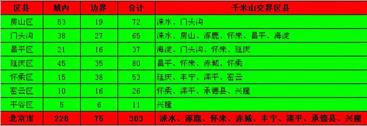 注2:北京周边千米高山名称不很规范,不同版本地图标注、当地村民称呼也不统一,而且不同版本地图山峰海拔标高也有差异;同一名称山峰在前面加上了行政区名以示区分(不同区县加区县名称、同一区县内的加乡镇名称)。