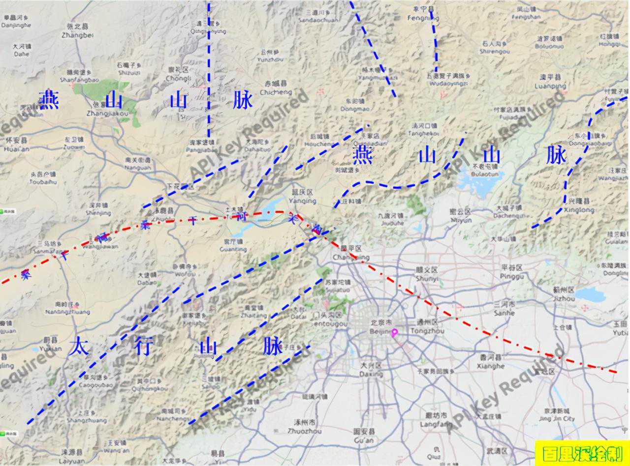 (北京周边千米高山线基本呈现为西南-东北方向)