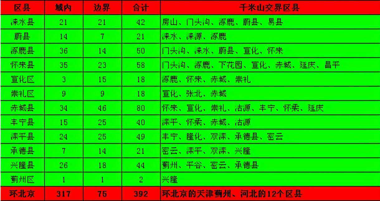 北京市除东南方向为平原外大多是有山区域,与之相应的环北京区县也呈现向东南开口的半环形,除尽最大可能收集北京市域千米高山外,鉴于环北京区县幅员辽阔,仅重点收集北京驴友容易到达及重点光顾区域的千米高山。