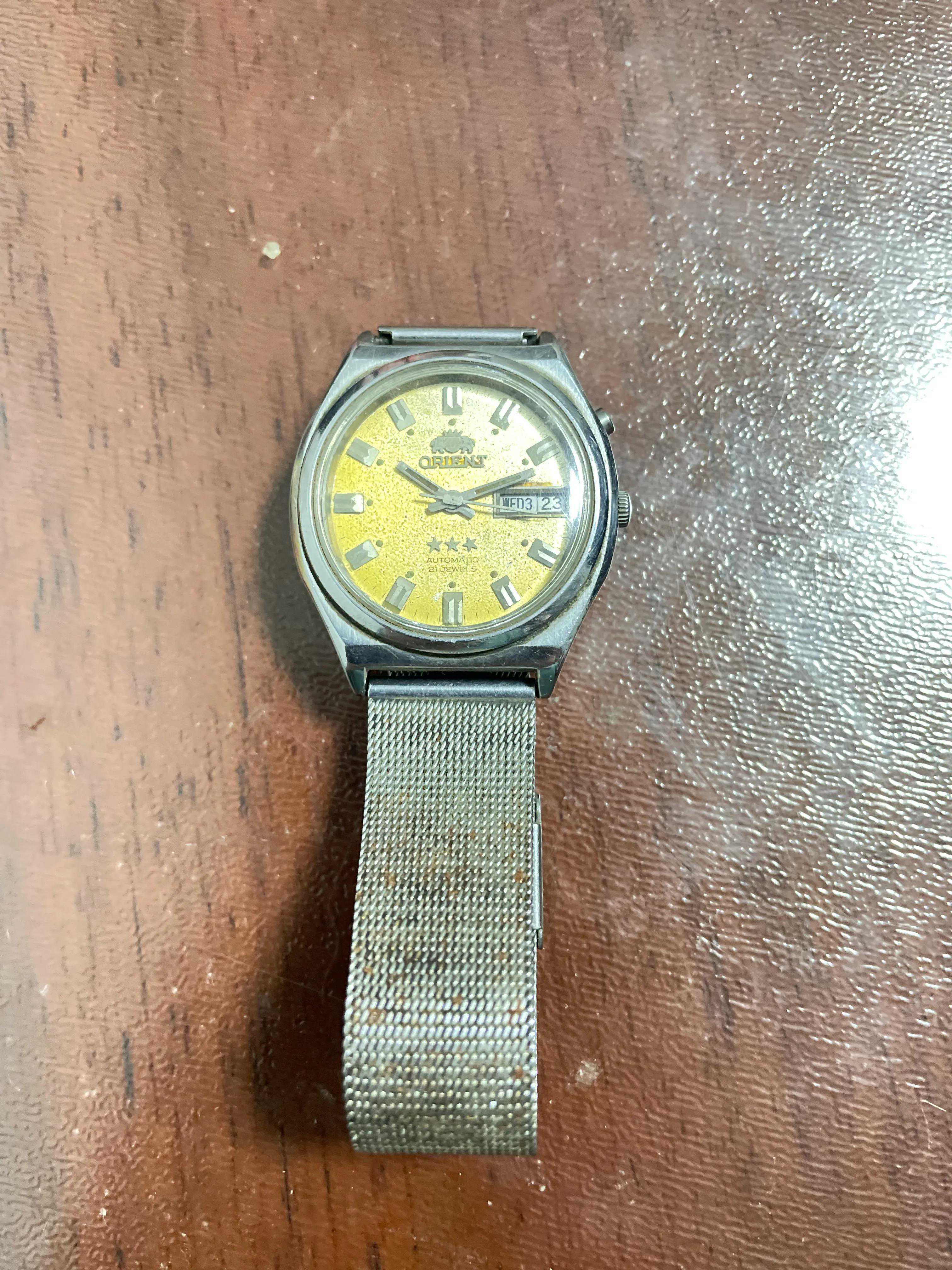 直到今天才知道父亲的手表是orient手表,是日本原装进口的,中文名为东方双狮,这款老双狮,做工精致,简洁不简单,成为80年代中国手表的主流。这块表应该是镀金刻盘,21钻星期、刻度机械表,当时的价格应该在200元人民币。当时200元基本要挣1⃣️年半的工分才能分到这么多钱!