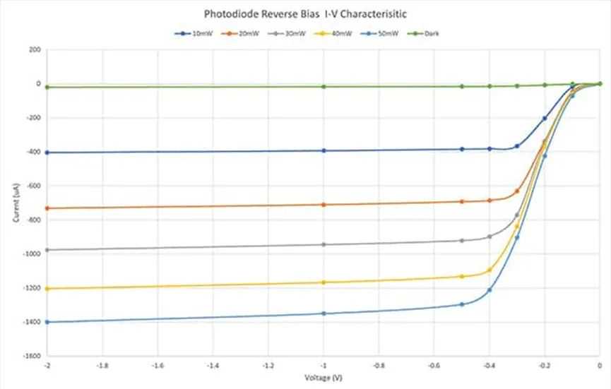 当具有足够能量的光线照射在耗尽层时,会电离晶体结构中的原子并产生电子空穴对。由于施加了偏置电压,现有的电场会把电子移动到阴极,空穴移动到阳极,从而产生光电流。光强度越大,光电流就越大。图3所示的反向偏置光电二极管的电流电压特性说明了这一点。