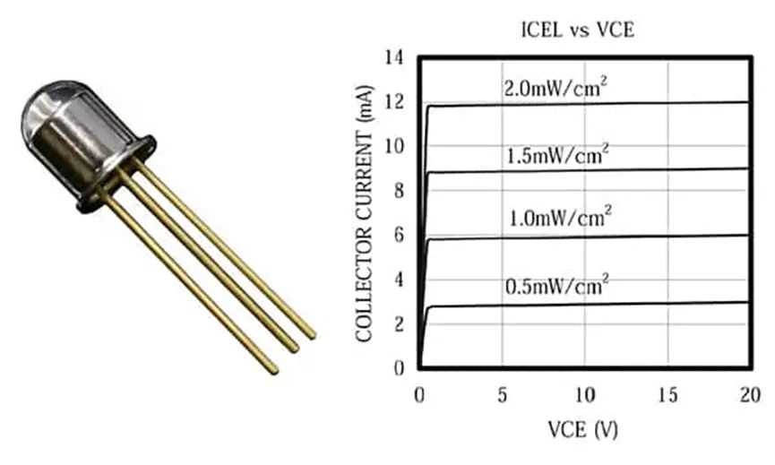 这种光电晶体管采用带有透明圆顶的金属封装罐。该图说明集电极电流是以光辐照度为参数的集电极至发射极电压的函数。由于晶体管的电流放大作用,集电极电流明显高于光电二极管中的电流。