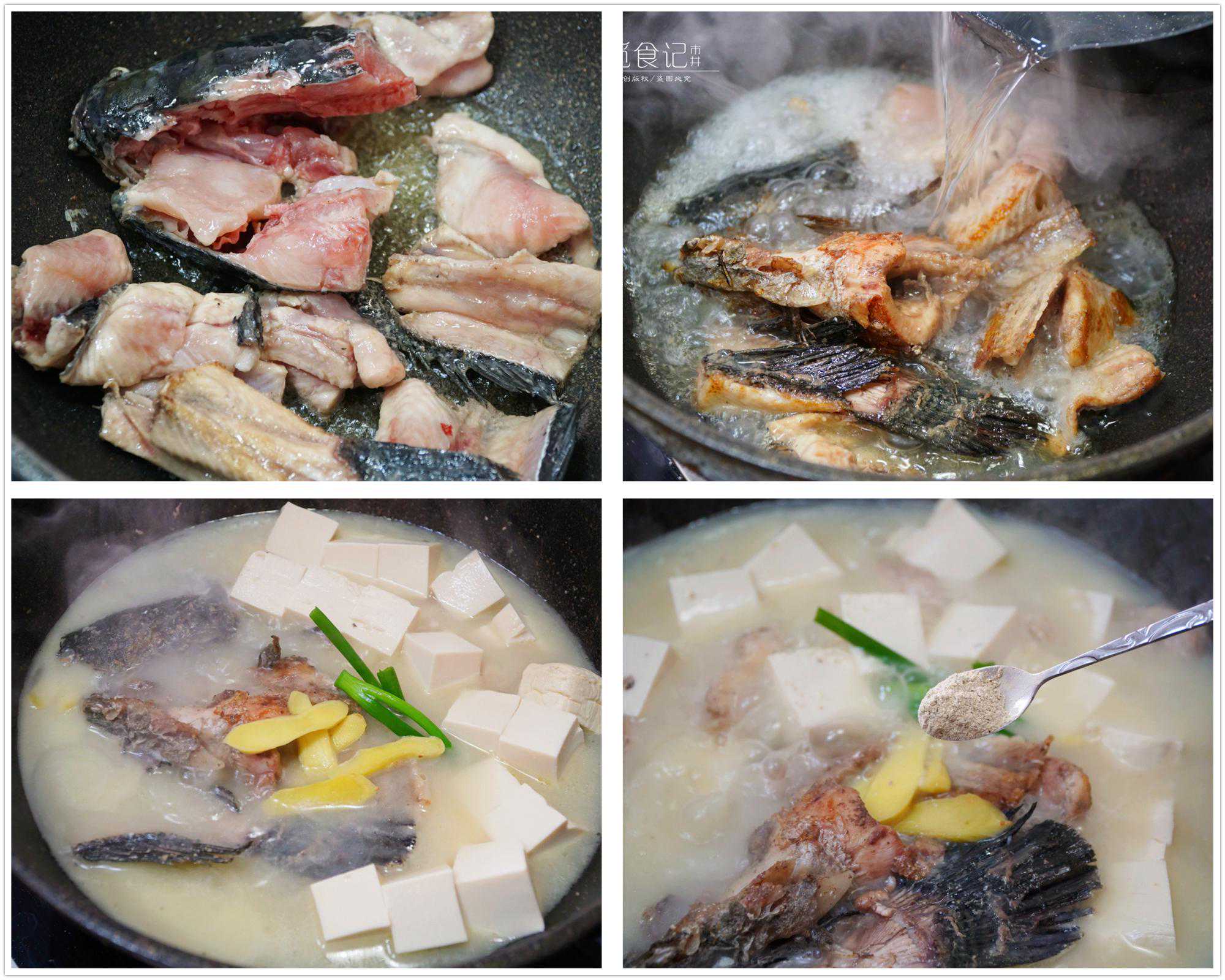 所用食材:鱼头、豆腐、姜、葱、料酒、盐、胡椒粉