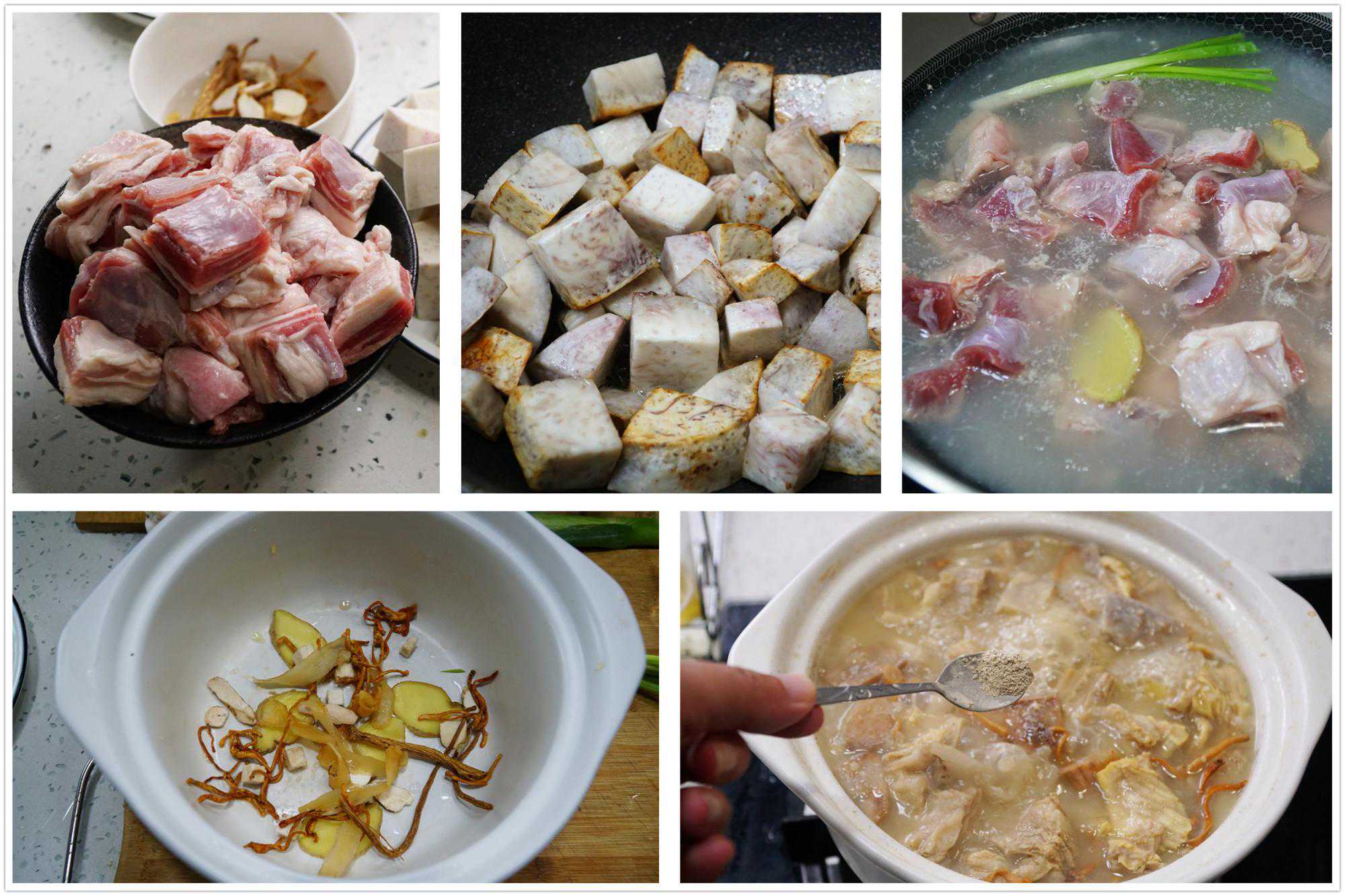 所需食材:羊肉2斤、大芋头1个、姜1块、小葱3根、党参、怀山药片、虫草花和枸杞适量、料酒4勺、胡椒粉和盐适量。