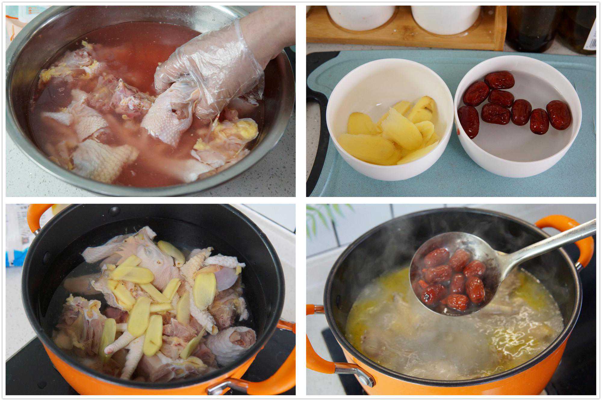 所需食材:三黄鸡1只、红枣8颗、生姜1块、枸杞适量、料酒1勺、胡椒粉和盐适量。