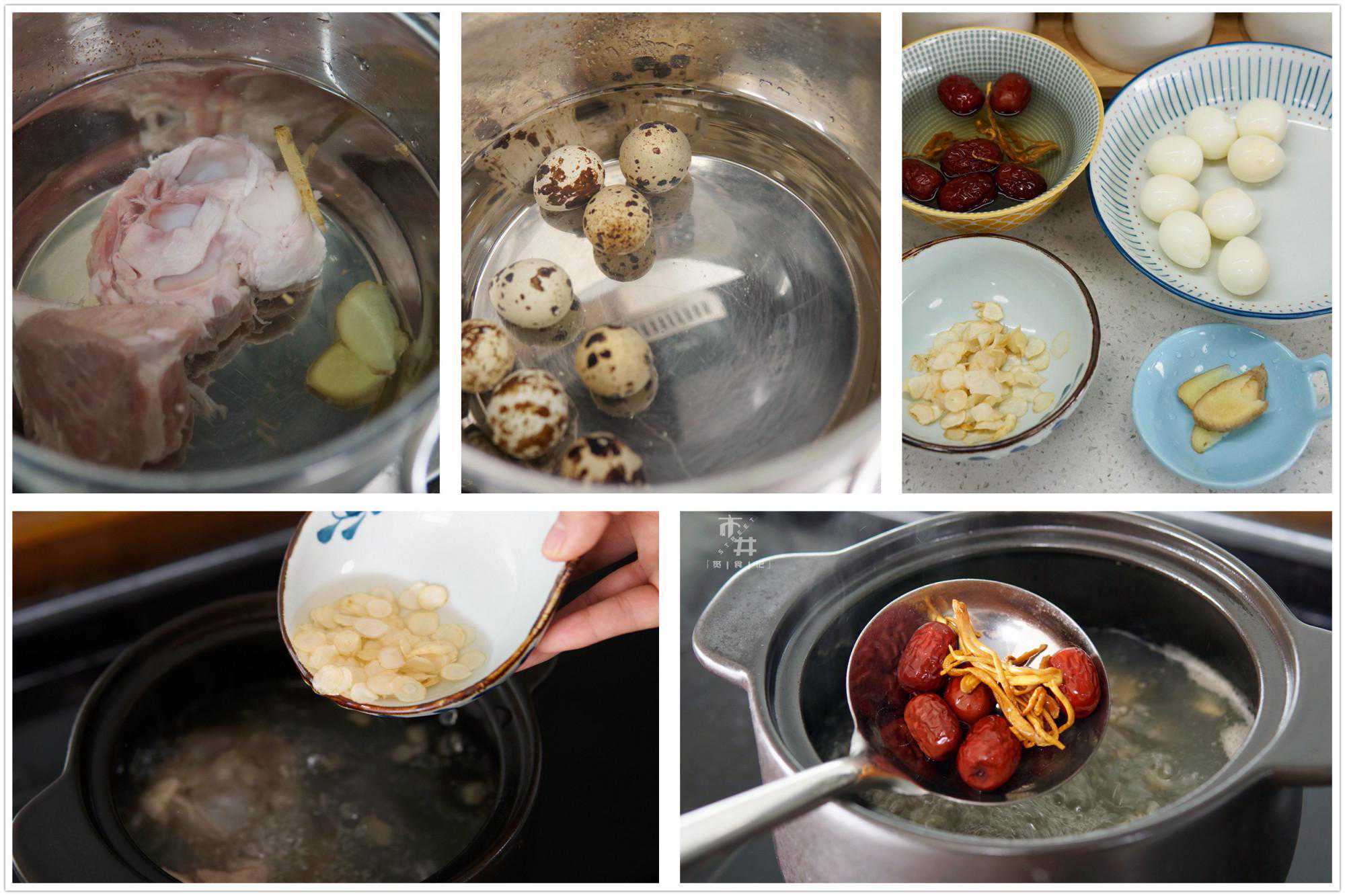 所需食材:大骨头、虫草花5根、西洋参片10片、红枣6个、鹌鹑蛋8个、姜1块、胡椒粉半勺、料酒、食盐和鸡精适量。