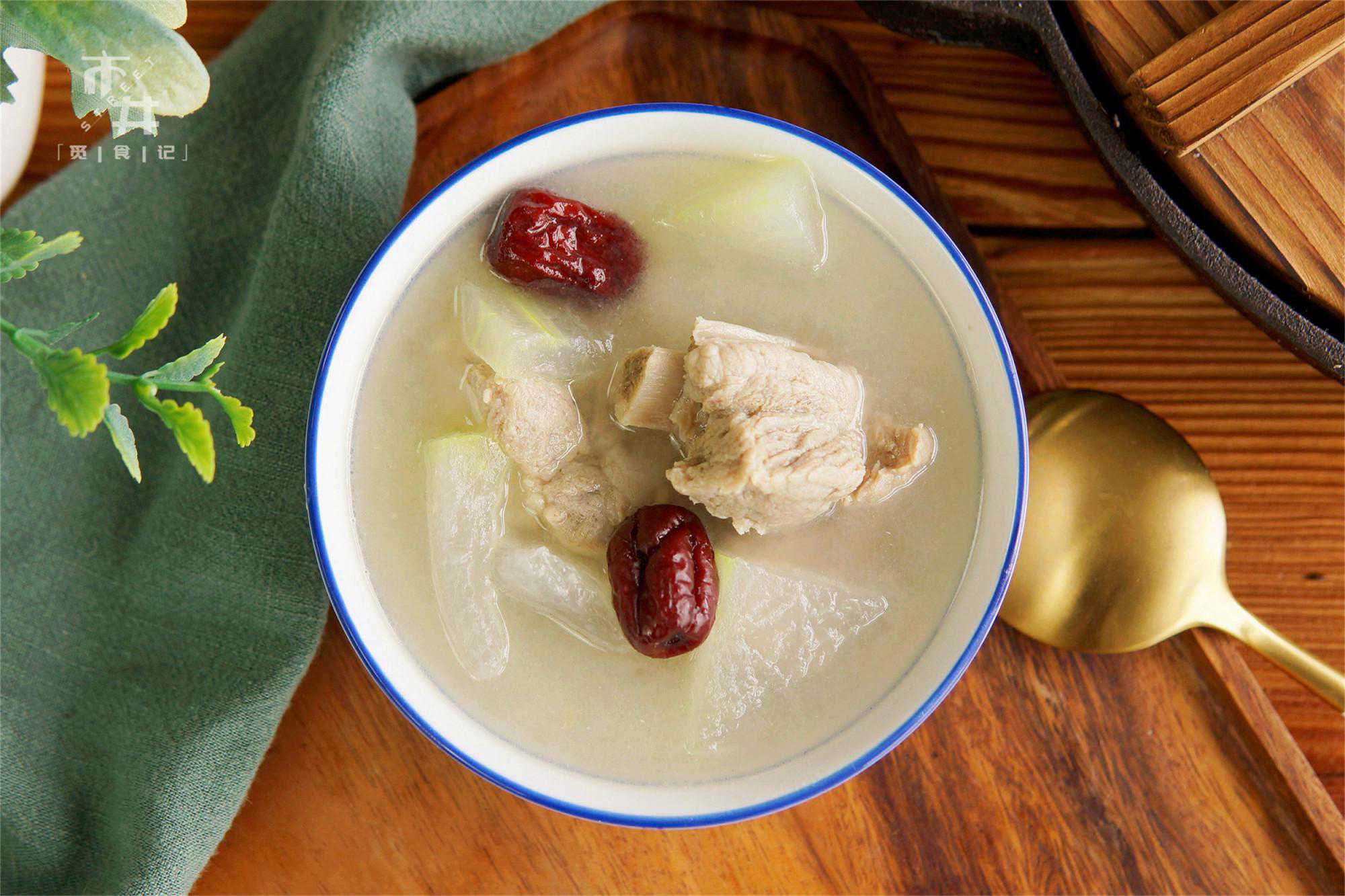 6、冬瓜排骨汤冬瓜排骨汤,味道鲜甜,清爽不油腻,冬瓜入口即化,排骨软烂入味,汤汁吸收了肉香与冬瓜的清香,汤鲜味美,一锅都不够喝。