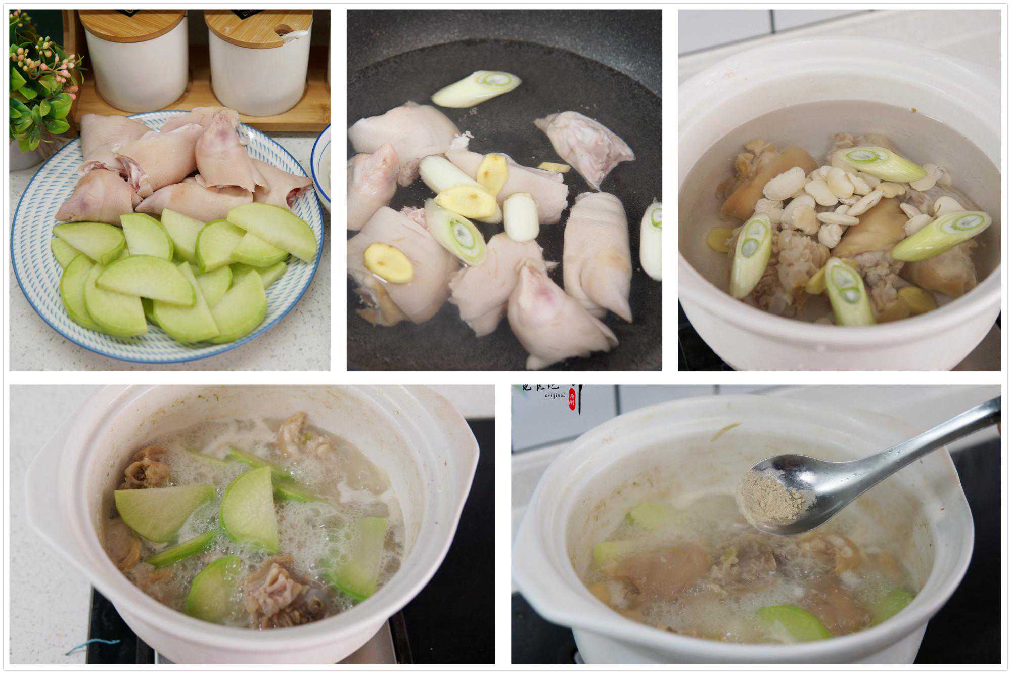 所需食材:排骨2根、冬瓜1块、红枣6颗、姜1块、胡椒粉半勺、料酒2勺、鸡精和食盐适量。