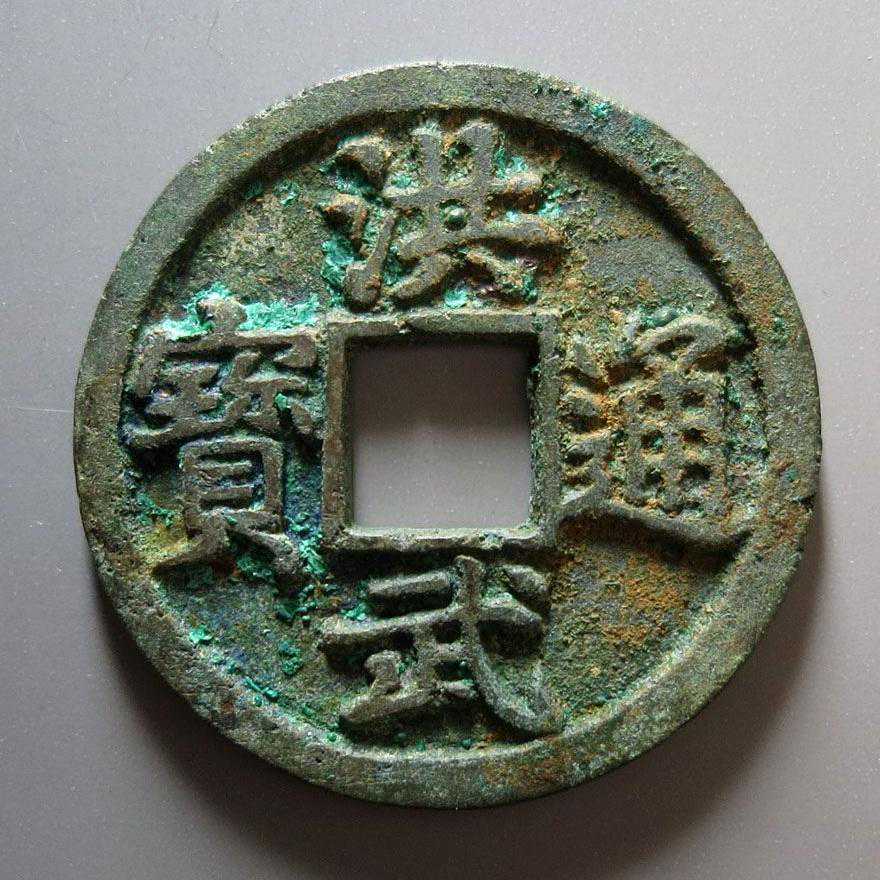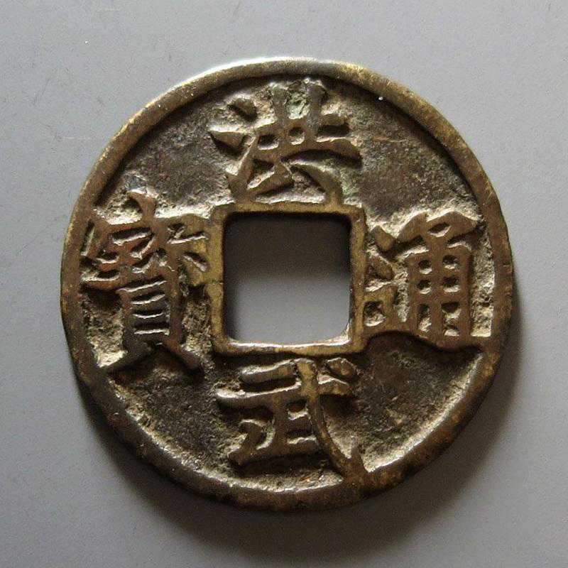 洪武元年(1368年)正月,朱元璋称帝,建立明朝,改元“洪武”,同年三月,开铸洪武通宝钱。明代钱文不称元宝,因为朱元璋的名字中有“元”字,要避讳,而且又要避讳元朝的“元”字,把所铸钱文一律叫通宝而不叫元宝,而不只是为避讳他自己的名字,所以自大中到永历,不论大小,都称通宝。