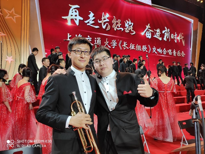 我在2016年12月加入交大管乐团、交响乐团,至今已经有六个年头。我在2017年7月—2019年7月担任管乐团、交响乐团小号首席;2019年8月—2019年12月担任佐治亚理工学院管乐团小号首席;2020年8月直博后,重新加入管乐团、交响乐团。乐团丰富的演出经历,成为我宝贵的人生积累。