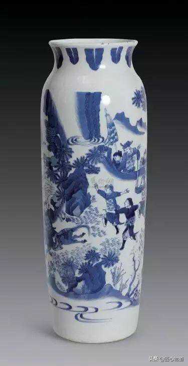 象腿瓶,即一统瓶,瓶形为广口外撇,短颈,肩部宽与口相若,身如直筒状,平底,造型如粗壮的象腿,所以又名“象腿瓶”。因“筒”与“统”谐音,有“大清天下一统”的寓意。多见于清初顺治、康熙两朝,品种有青花、五彩。