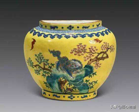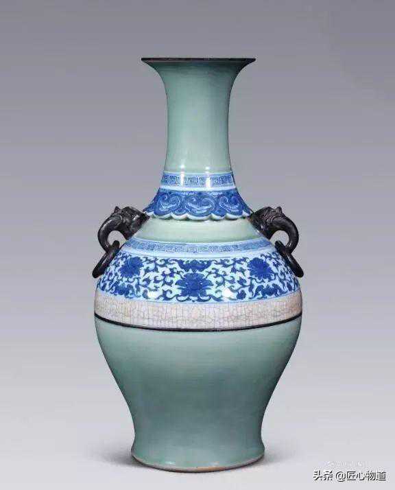 如果没有耳,这就叫琵琶尊,始于清代,模仿商周青铜尊,是最流行的阔口瓶。有耳的琵琶尊之叫法,是耳名加尊。比如耳做成鹿头的,叫鹿耳尊。这个琵琶尊的耳是如意形的,就叫如意耳尊。是吧?和上一个重名了。区分的办法是把釉色或者画面加进名字里,这个叫青花如意耳尊,上一个叫粉彩如意耳尊。