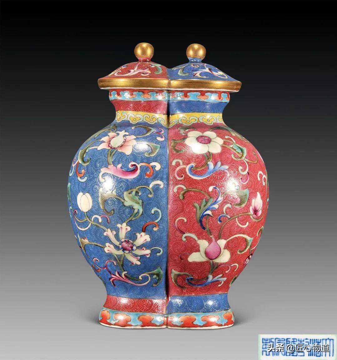 形制如连体双鱼,又称“连体瓶”、“双鱼瓶”或“合欢瓶”,在唐三彩中已出现,流行于清代。因两瓶联成一体而得名。通常是两瓶的腹部粘连在一起或自口至底通体相连。