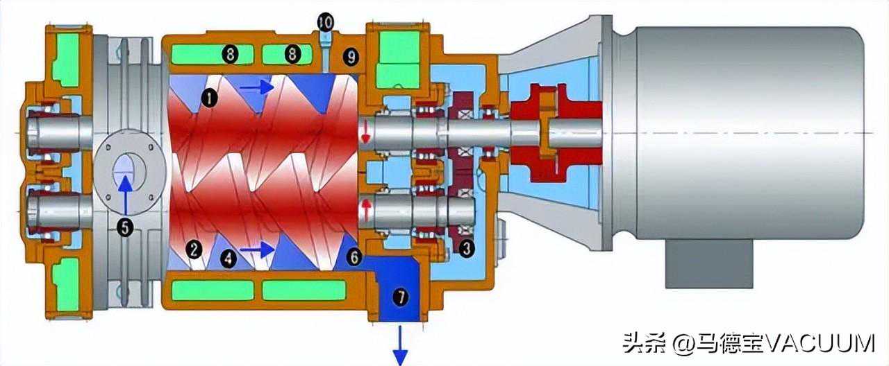 传动轴连接主动转子,通过同步齿轮带动从动转子旋转,在壳体上开有冷却水通道,用来冷却转子和排气口温度,同步齿轮及轴承用油润滑,轴承和壳体内部通过密封件来密封以达到无油的效果。