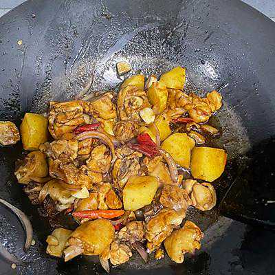 5、加入土豆翻炒几下加入生抽老抽一点点十三香豆瓣酱翻炒