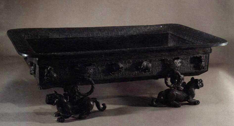 四只伏虎足,虎背上倒伏夔龙托起盘;盘内底满布各种浮雕龟、鱼、蛙等水生动物,间有龙纹;盘腹壁饰各种浮雕禽兽及人首鸟身蹲坐形象,中间间有衔环兽面。各种装饰充满想象!此器为清宫旧藏。