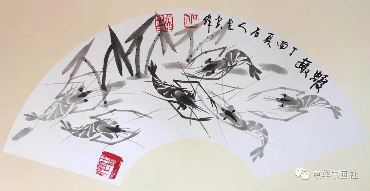 汪世炎画中的虾悠然自得,无拘无束,不问王与侯,不听龙怒庭,不畏权势,不逐名利,脚踏实地。观其运笔,虾头一笔重墨,虾眼横出两笔,用笔流利,技法已趋精熟。