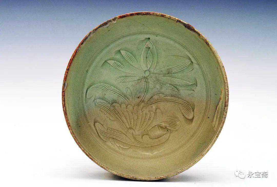 宋或以前越窑青釉外莲瓣内龙纹钵底足永宝斋藏