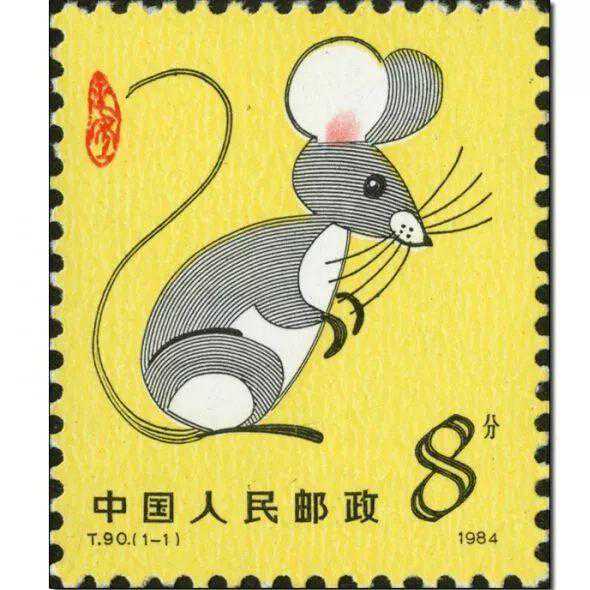 1984年1月5日,T90《甲子年》特种邮票发行,这是我国第一轮生肖邮票的第5套。全套1枚,图案是淡黄底色上一只灰白相间、蹲立的漫画老鼠,由我国著名漫画家詹同设计。