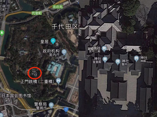 如前文所述,退位前所举行的10项仪式之中,有4项是在“贤所”、“皇灵殿”、“神殿”三座合称“宫中三殿”的建筑中举行的。在这里借用卫星地图说明一下宫中三殿的具体位置。