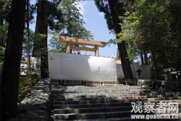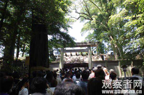 此外,值得一提的是,伊势神宫的社殿建筑结构被称为“神明造”,在日本的神社建筑中也是非常具有独特代表性的建筑风格。供奉八咫镜的伊势神宫内宫祭祀的是皇祖神天照大神,而宫中的贤所也供奉着八咫镜的复制品,在某种意义上,贤所可以看作一个在宫中天皇身边建造的伊势神宫“宫中办事处”。因此在拜谒过贤所后,再亲自前往伊势神宫,便代表着一个从宫中进行的“分”仪式,到亲拜神宫“本”仪式的过渡过程。