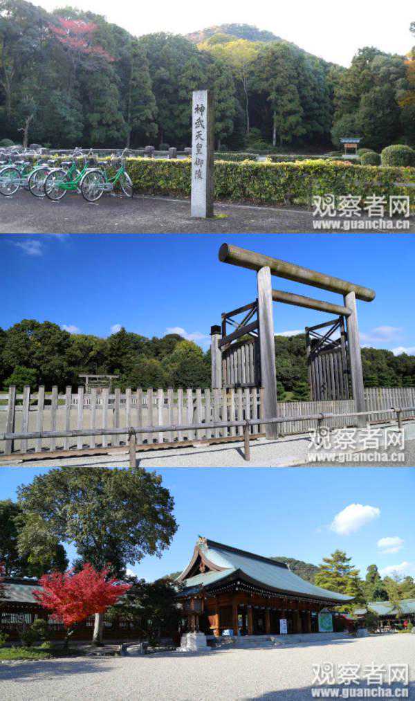 上两图为神武天皇陵,下图建筑为橿原神宮(作者供图)