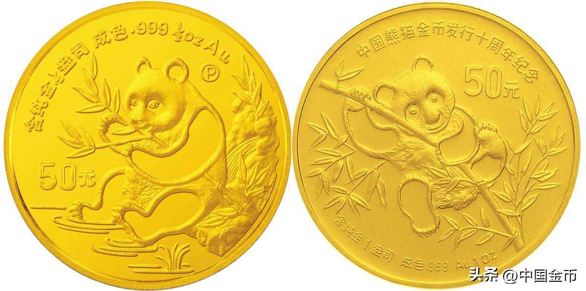 (右)为中国熊猫金币发行十周年1盎司金币,直径27毫米