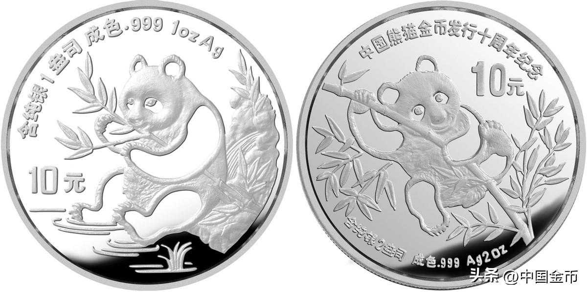 (右)为中国熊猫金币发行十周年2盎司银币,直径40毫米