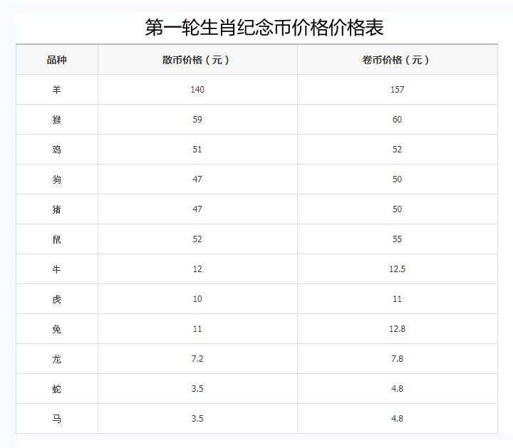 2003年生肖羊流通纪念币价格最低的时候只有八块钱一枚,真可谓物美价廉。可是当时人们还是认为他不值这个钱。到2008年10月份的时候,生肖羊流通纪念币的价格已经涨到了25元1枚。当时的人们对其更是不屑一顾。到2012年的时候,生肖羊的价格最高的时候涨到300元,一轮生肖纪念币出现了整体性的攀升,远远超出了投资者的基本预期。后来,随着人们对生肖并热情地降低和邮币市场整体的低迷,价格有所回调,现在的市场价格我给大家收集整理了一下,列了一个表格,大家可以参考一下。
