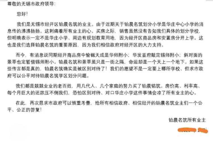 目前在互联网上可以看到这封信。实话说,看了这封信让人对这副嘴脸感到好笑,理由极其牵强,比如“买房之初,销售没有告诉业主具体的学校划分,但明确表示一定不是华庄小学”。