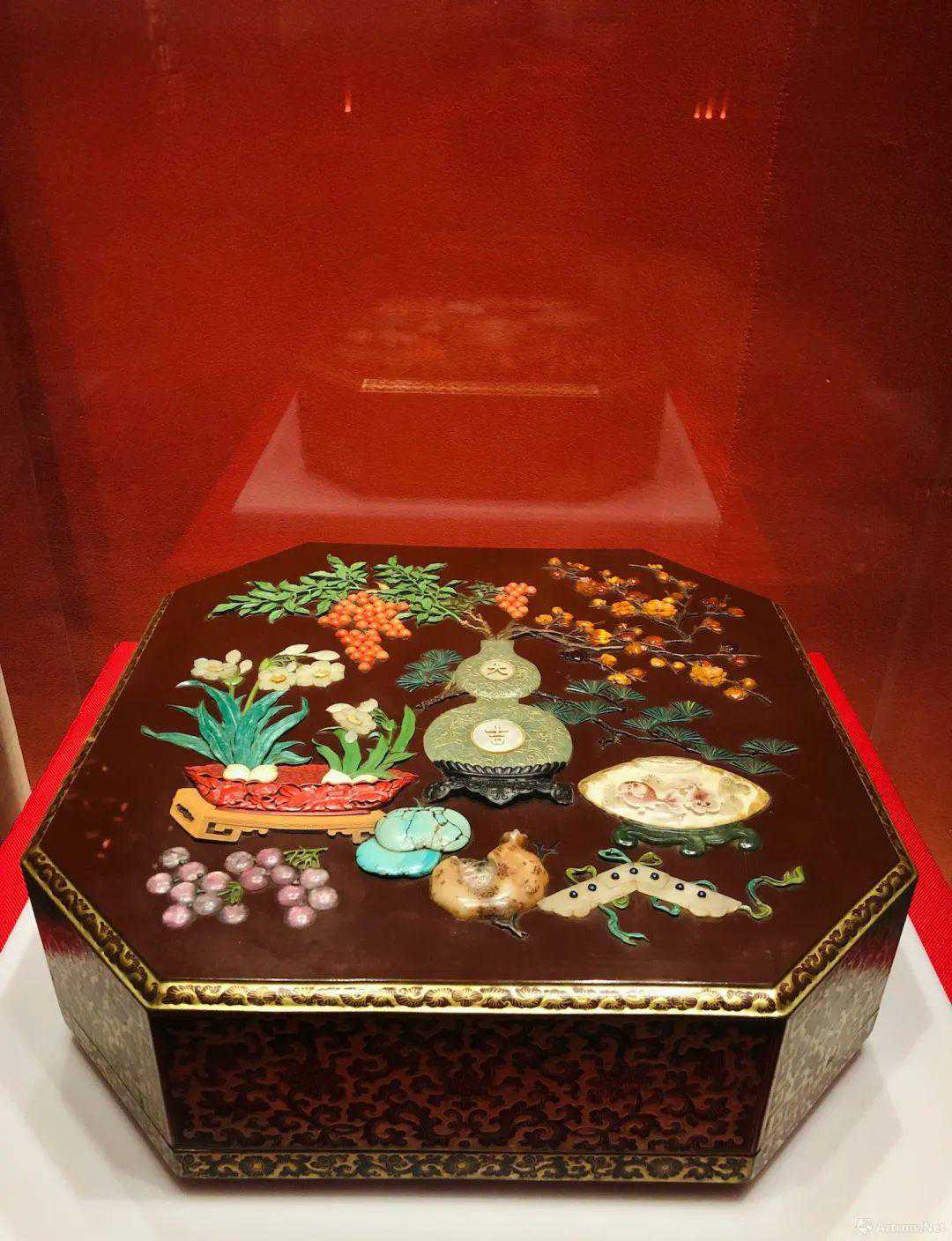 另外一件则是将各式团花集于一体,所镶嵌宝石与漆器表面平整。