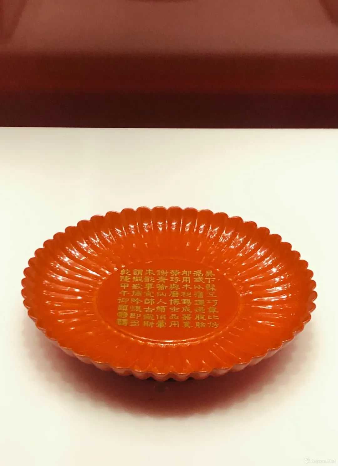 这件是仿漆釉工艺呈现出来的佳作,乾隆朝仿朱漆釉的典型代表。这个技术是清代景德镇御窑厂创烧的新品种,可见有仿朱漆、仿雕漆、仿黑漆、仿漆嵌螺钿等。其均属低温釉,以创烧于乾隆朝的仿朱漆及仿雕漆最为常见。