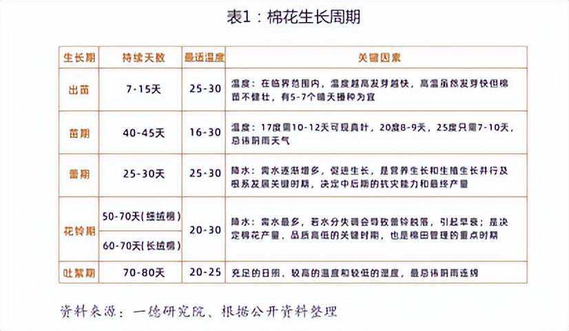 棉花的生长周期较长,大约210天,可细分为萌芽出苗、苗期、蕾期、花铃期和吐絮期5个阶段。棉花喜热耐旱,具有较强的再生能力,一般春季(或初夏)播种,当年完成生育周期,相对于其他农产品,受自然因素的影响较大,不同阶段对温度和水分的要求各异。对于长绒棉和细绒棉,生长周期也有略微的区别,长绒棉现蕾较早,同期播种条件下一般比陆地棉早现蕾5-10天。长绒棉与陆地棉相比,棉铃发育期(开花至吐絮)较长,一般比陆地棉长10天左右,需要较多的积温和光照及充足的水、肥供应。