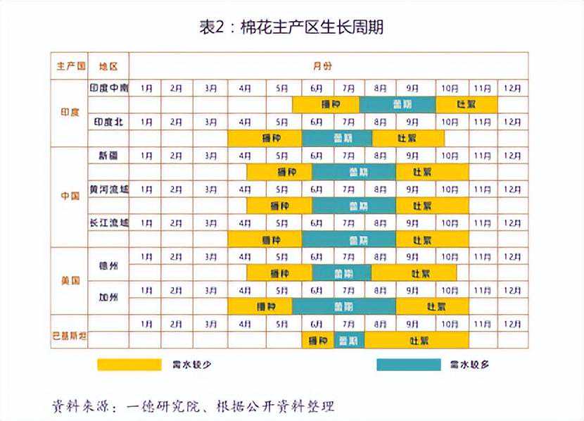 根据各阶段温度和需水特点,将播种、出苗期和苗期归为同一阶段,以“播种”显示;将蕾期和花铃期归为同一阶段以“蕾期”显示。其中印度、中国、美国和巴基斯坦四大棉花主产区生长周期如表2所示。全球主要棉花输出国因所处的纬度和气候不同,其棉花生产期和收获期存在明显差异。由于全球棉花收获持续时间跨度大多为当年的8月至翠年的7月,因此USDA习惯以市场年度表示棉花产销,如2018/19国际市场年度就是指2018年8月至2019年7月这段时间,我国的棉花收获基本从9月开始,国内市场年度区间指当年的9月至盟年的8月。
