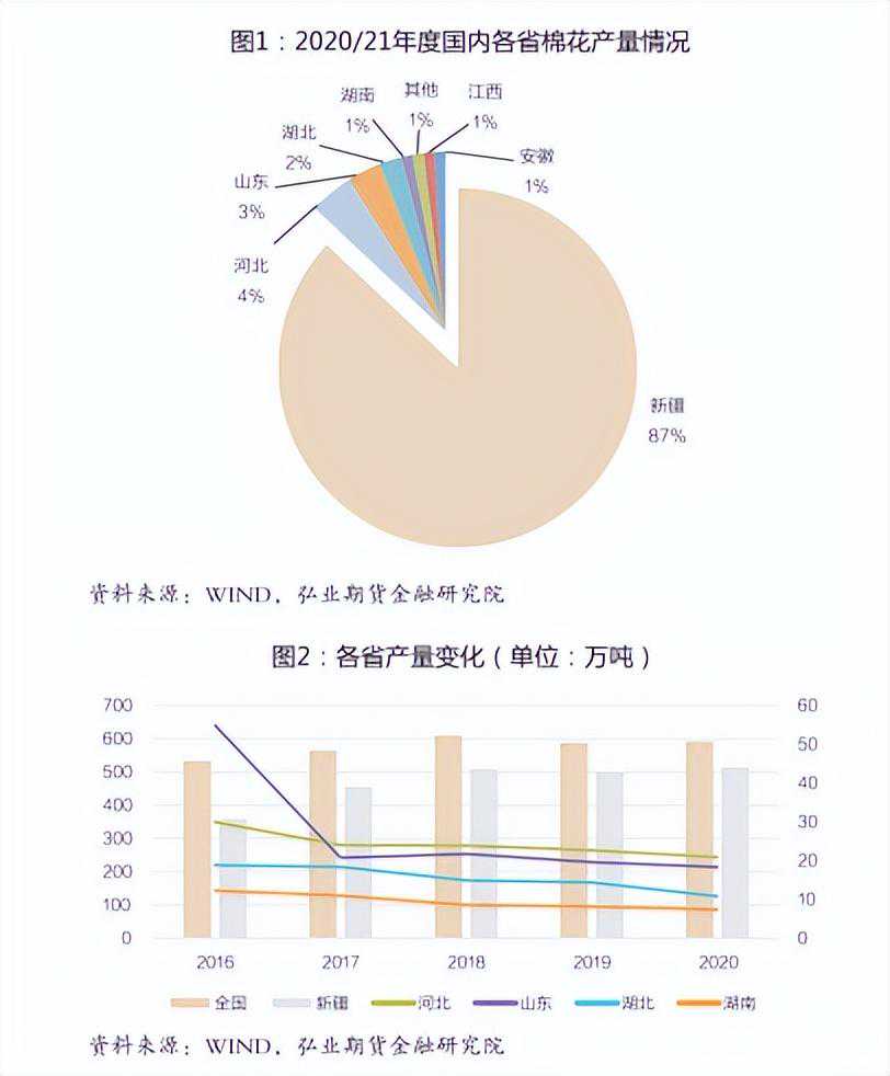 我国棉花的主产区在新疆、山东、河南、河北、湖北、安徽、江苏、湖南、江西这9个省,这9省2017/18年产量占比超过了全国产量的97%。近年来,棉花供给结构明显优化,黄河流域、长江流域由于人工成本高、棉花效益低,加之新疆与内地补贴力度存在显著差别,棉花生产规模快速萎缩,次宜棉区逐步退出生产;新疆优质棉花产量占国内比重由目标价格改革前的56%提高至2020/21年度的87%。