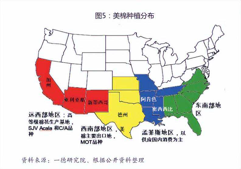 美国农业具有专业化的特点,棉花种植90%集中在棉花带,位于北纬35%以南的美国东南部,东起大西洋沿岸的北卡罗来纳州,西到加利福尼亚州东部。气温高,无霜期长,土壤肥沃,有利于棉花生长。美棉品种以陆地棉为主,长绒棉为辅。按照气候特征和地域特点划分为西部棉区、中南棉区、东南棉区和西南棉区。