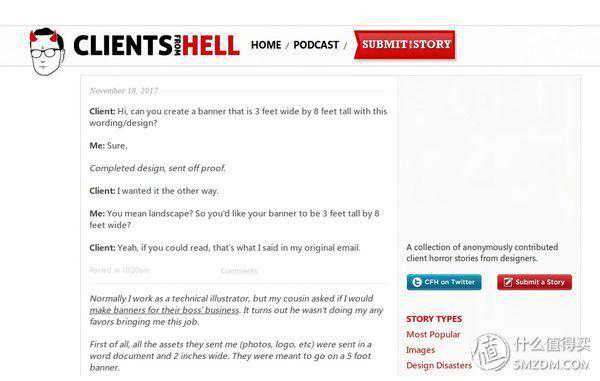 外国设计师也喜欢吐槽甲方啊,Clientsfromhell从字面翻译就是来自地狱的客户,这是一个专门吐槽老板或甲方的网站,在这里你可以看到有着各种奇葩的需求和问题的老板或甲方,你也可以在这里吐槽下你自己的老板或甲方。看来吐槽甲方或老板是全世界设计师们的一致爱好啊。随便摘录几个以飨观众。