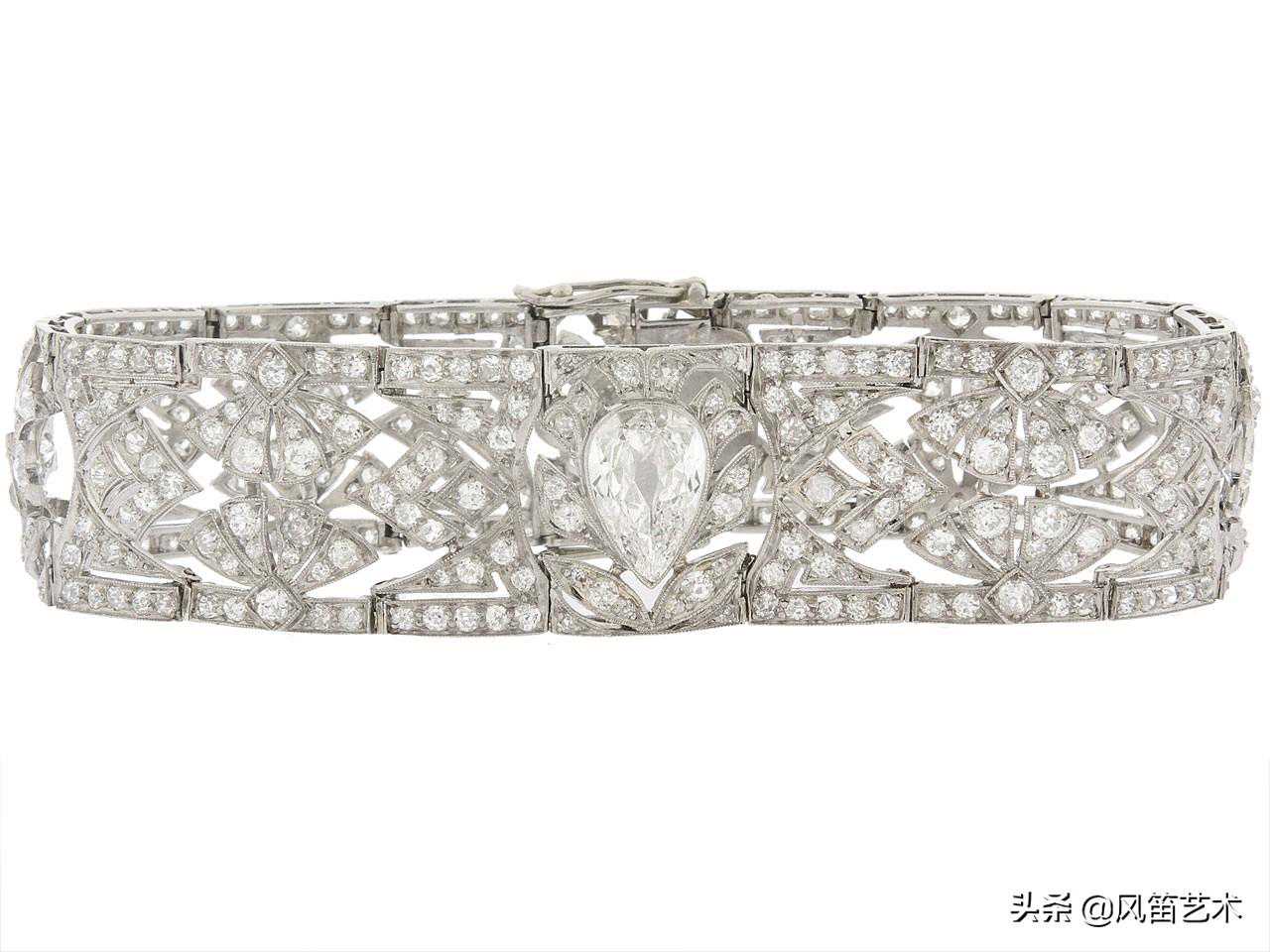 ▲爱德华时代铂金钻石手链,设计为古老的欧洲切割和旧矿用切割钻石镂空叶状带,表圈镶有旧矿梨形钻石和欧洲切割钻,