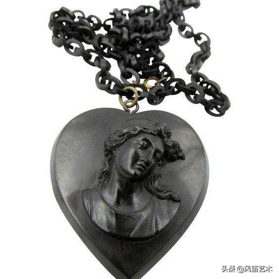 ▲维多利亚时期惠特比(Whitby)煤玉硬橡胶心形浮雕项链,