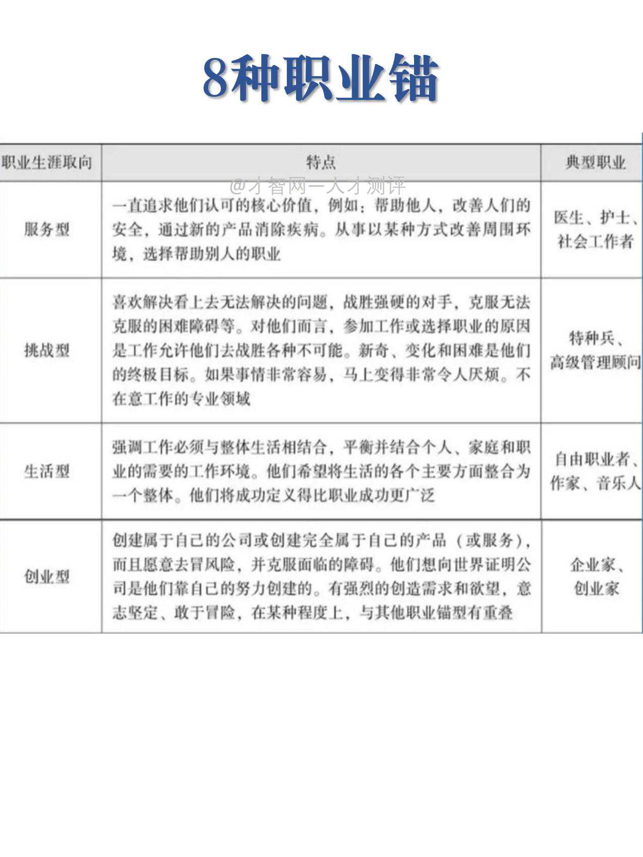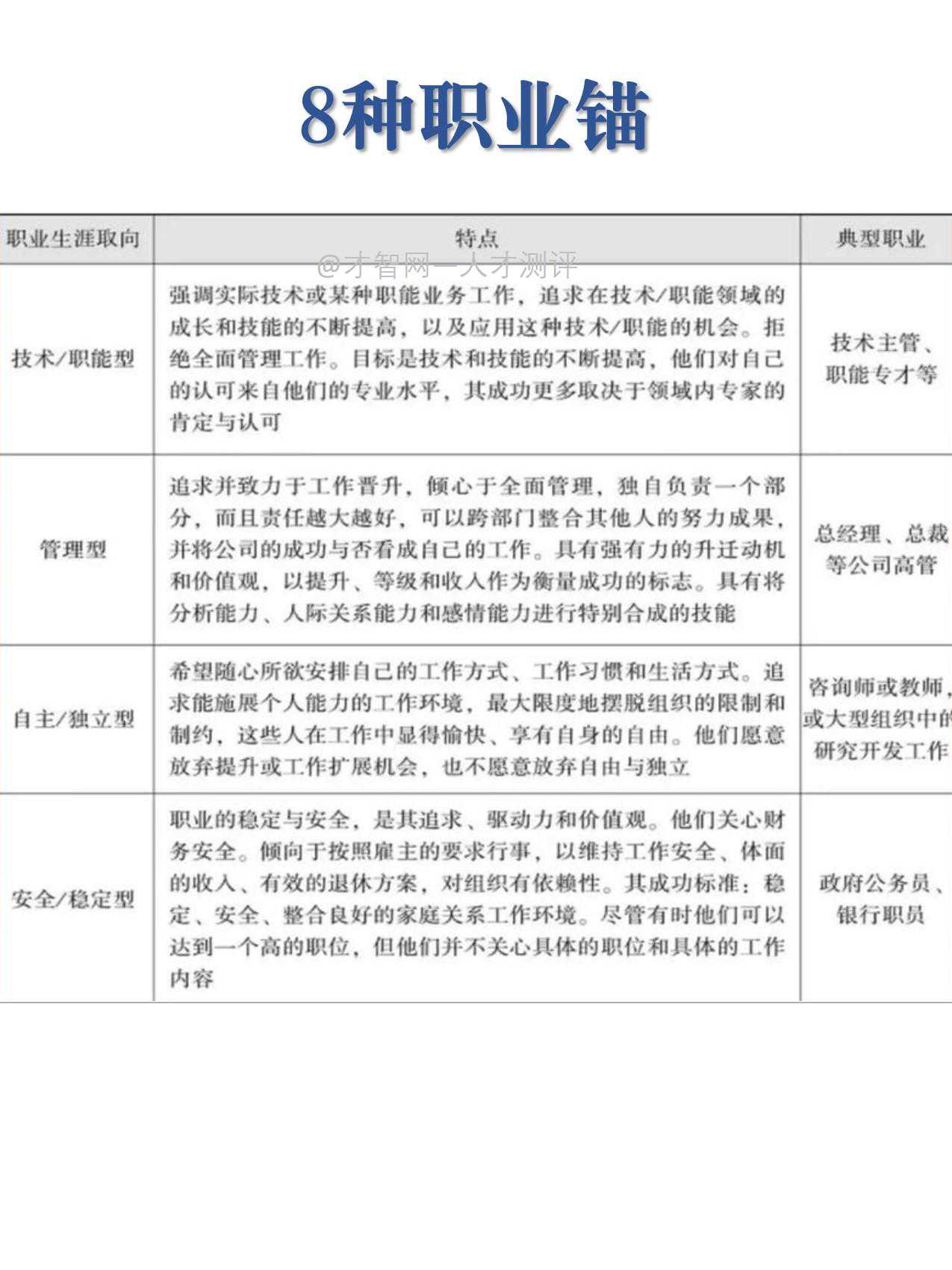 ⏭️著名的职业指导专家施恩先生将职业锚分为技术/职能型、管理型、自主/独立型、安全/稳定型、创造型、服务型、挑战型、生活型8种类型,并推出了职业锚测试量表。