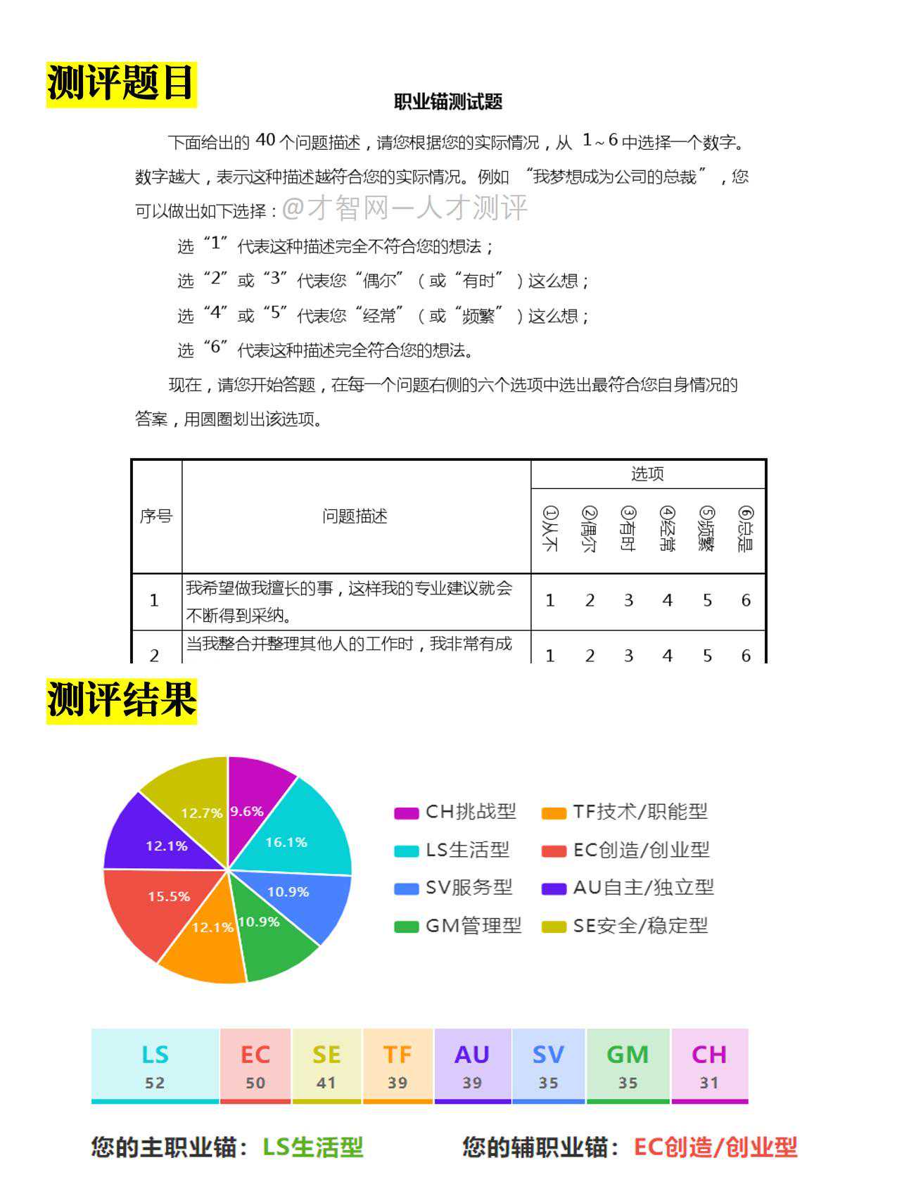 需要指出的是,职业锚测试与其他职业测评不一样,它不是用来测试人的潜能或挖掘潜能的,而是测试人的动机和价值观。