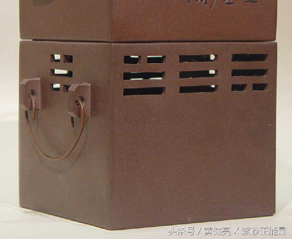 此壶作四方暖炉座式,牛眼盖,湾流,软式提梁。暖炉座透刻八卦,用以通风,两侧置双耳软提梁座。盖内钤「耀庭」楷书阴印,壶及炉座底均钤「铁画轩制」阳文方印。壶身刻写「客醉每从花底散,诗成自选竹间题」,署「玉屏」。紫砂壶对温度传导性极佳,易受外在的温度影响。不同于潮汕地区烘炉之煮水功能*,此炉是专为寒冷天气沏茶时所需而设计的,炉座内放置碳火,壶置其上,可保持茶汤热度,不至于快速冷却。