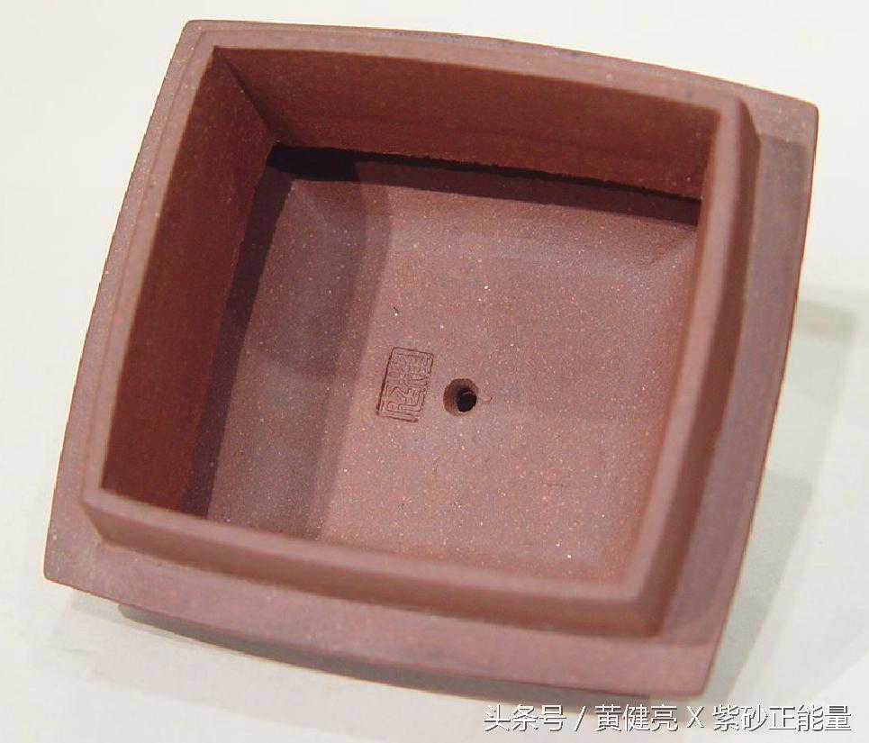 此汉方式又名秤铊方壶。紫砂胎泥绵密,器型精致爽朗,方形壶身曲弧的线条,处理得内敛雅致。壶盖内墙泥片的成形工法,颇具古制。盖内钤「耀庭」阴文小方章,壶底钤「铁画轩制」阳文方印。