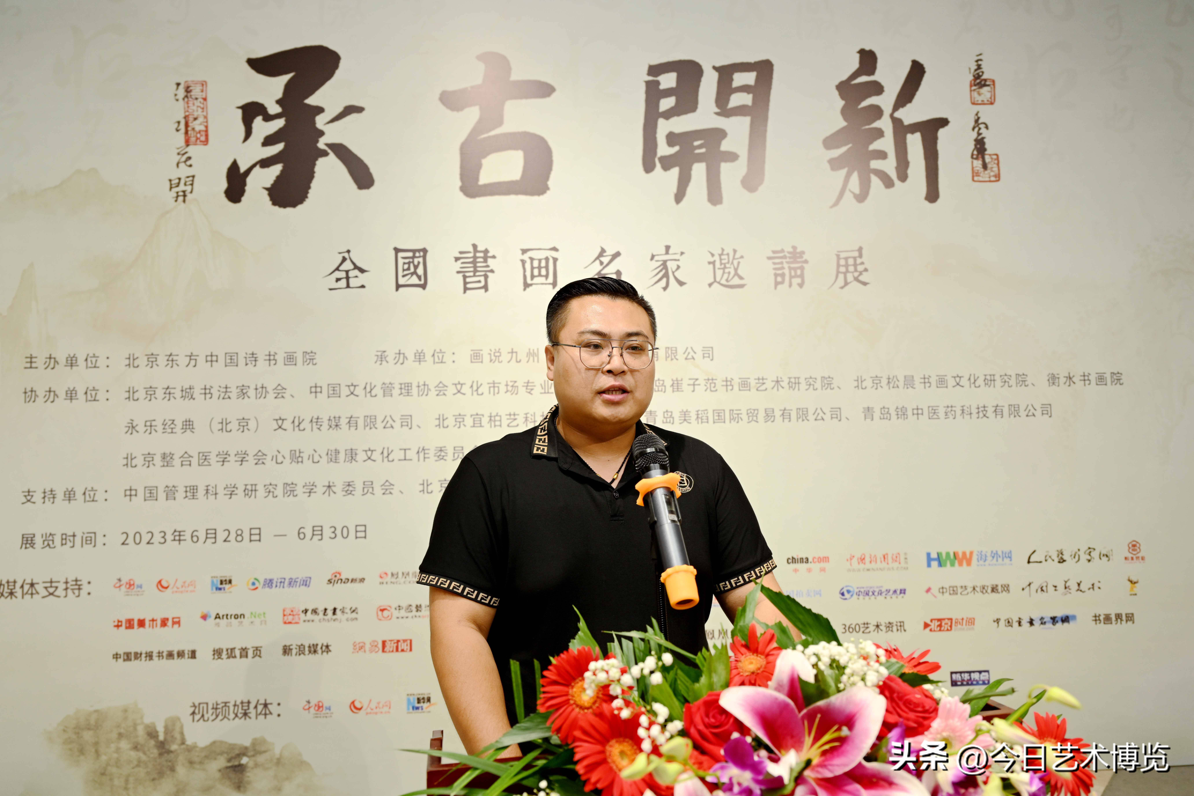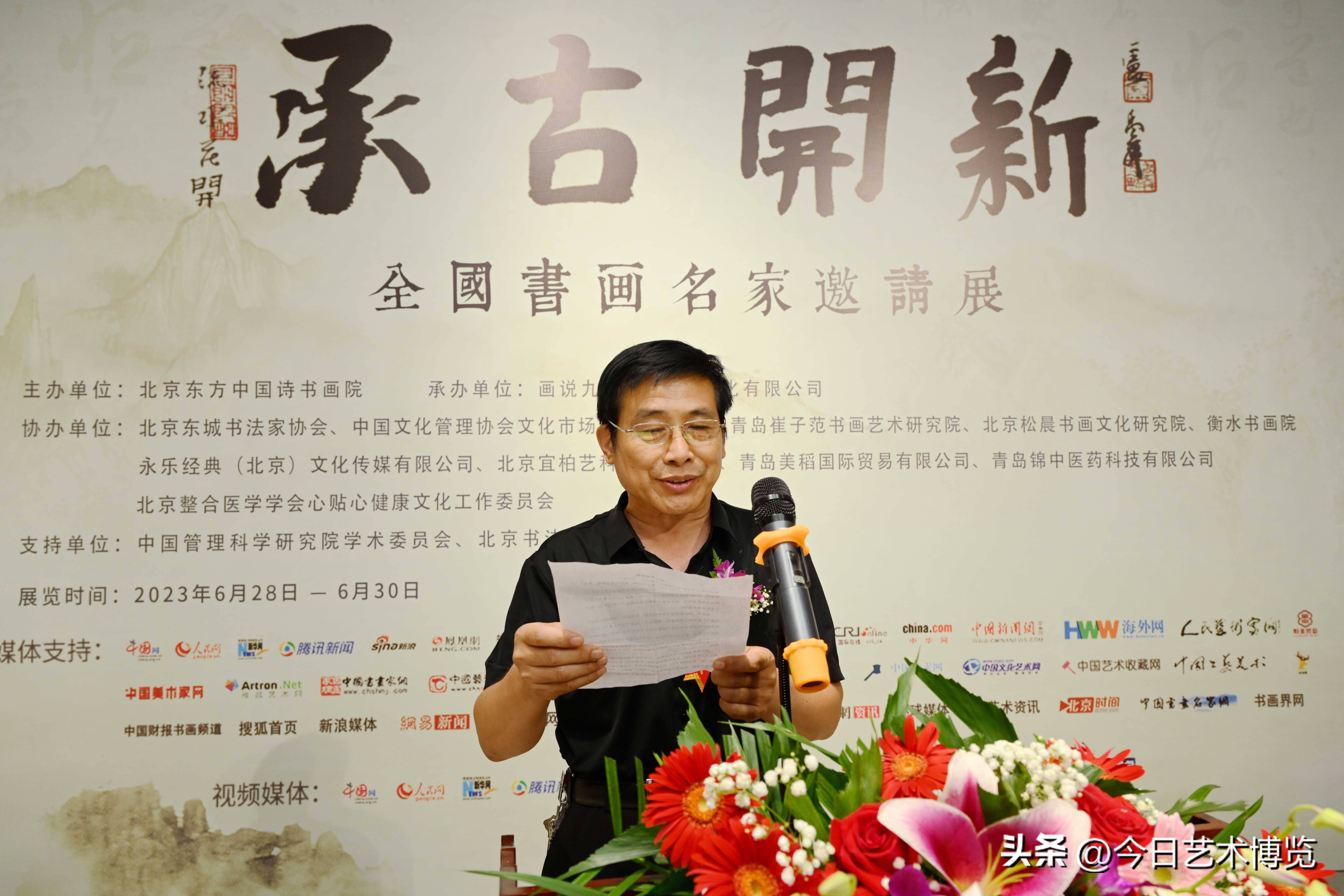 6月28日下午3时,由北京东方中国诗书画院主办;画说九州(北京)文化有限公司承办;北京松晨书画文化研究院、崔子范书画艺术研究院、北京宜柏艺科技有限公司、永乐经典(北京)文化传媒有限公司、青岛美稻国际贸易有限公司、青岛锦中医药科技有限公司协办的“承古开新·全国书画名家邀请展”在北京炎黄艺术馆盛大开幕。开幕式由中国书法家协会理事、北京书法家协会副主席田伯平主持。