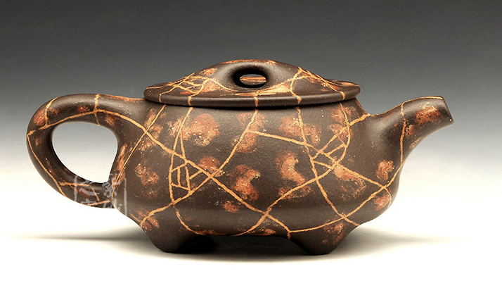 三角形壶身有所压扁,反倒是三鼎足和壶钮有所放大,如此一来,造型上的古朴韵味和端庄感受更有冲击力。尤其是那拉长的桥型钮,更像是飞虹一般。直嘴和三角形把与以往相同。特色在于开片装饰,不规则的纹理带来的感受却自然有趣。