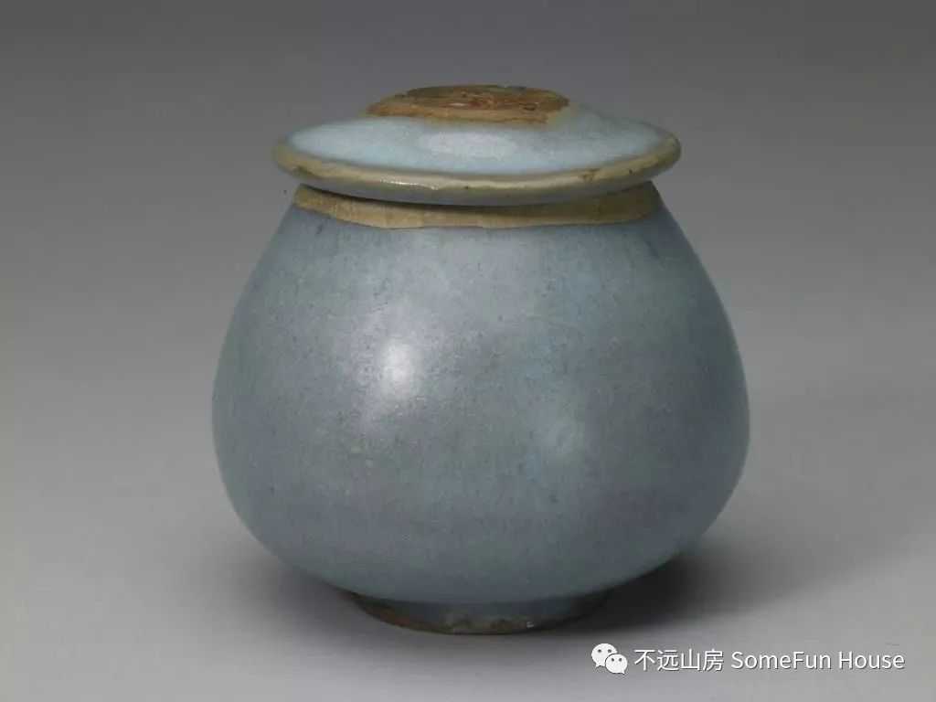 大都会艺术博物馆藏金代钧窑天青釉玫瑰红窑变鸡心盖罐