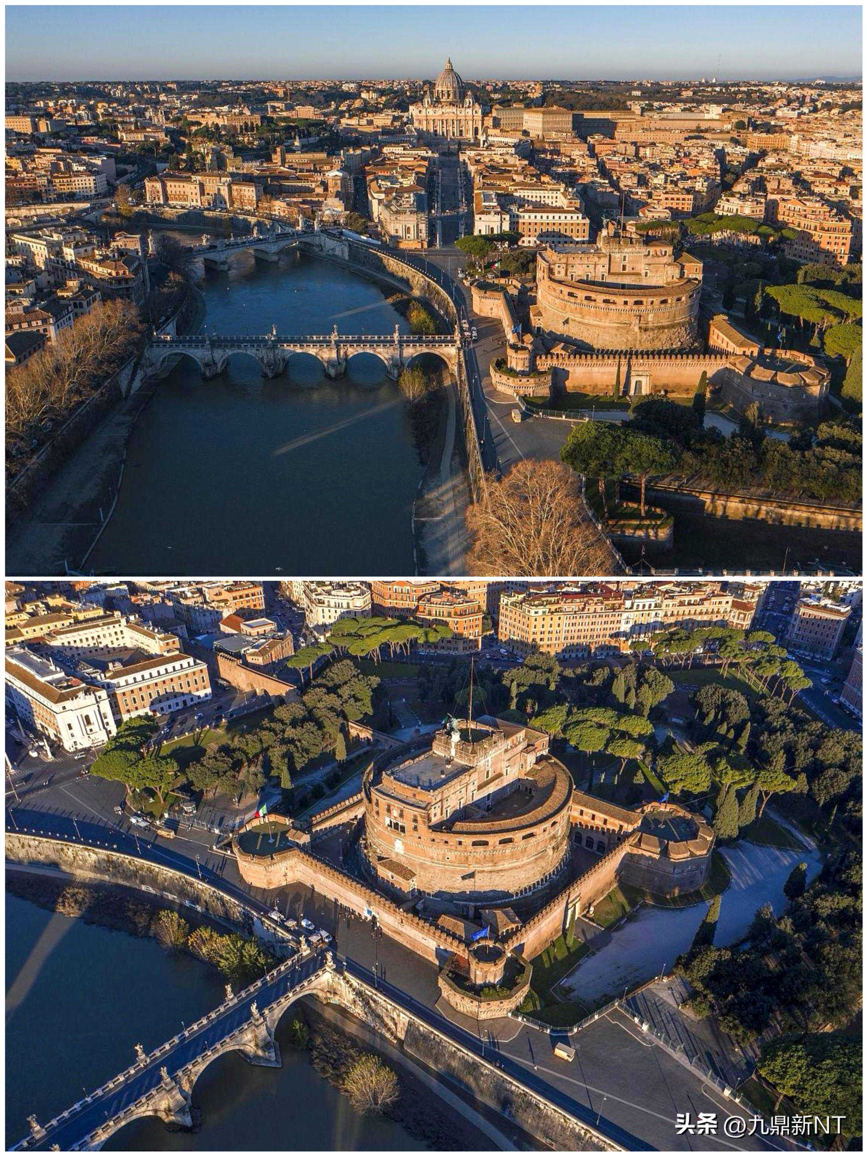 圣天使堡近处俯瞰及立面细节,近2000年岁月中城堡经历了多次破坏和修复,建筑功能与格局也被改得面目全非